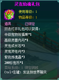 2、灵宠仙魂礼包:开启后获得:中级宠物祝福果*1、高级灵兽内丹*1、灵宠成长石*3、灵宠灵性丹*3、紫色炼魂晶*3、200珍宠币*1