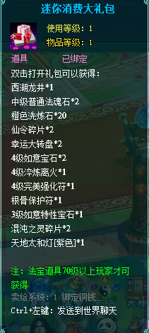 1、消费礼包中的法宝道具等级70级以上玩家才可获得。