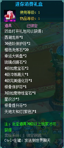 1、消费礼盒中的法宝道具等级70级以上玩家才可获得。