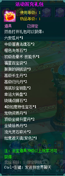 1、充值礼盒中的法宝道具均为70级以上玩家才能获得。