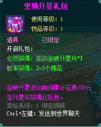 坐骑升星礼包:打开获得高级升星丹*1,有概率获得2~5个桃花